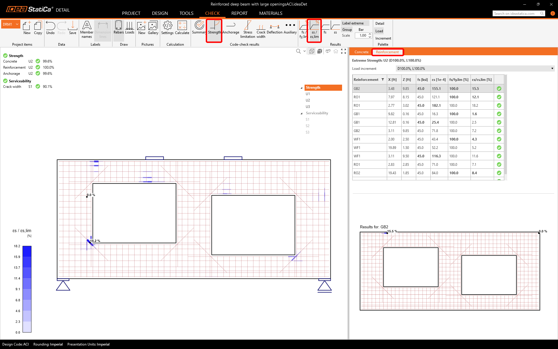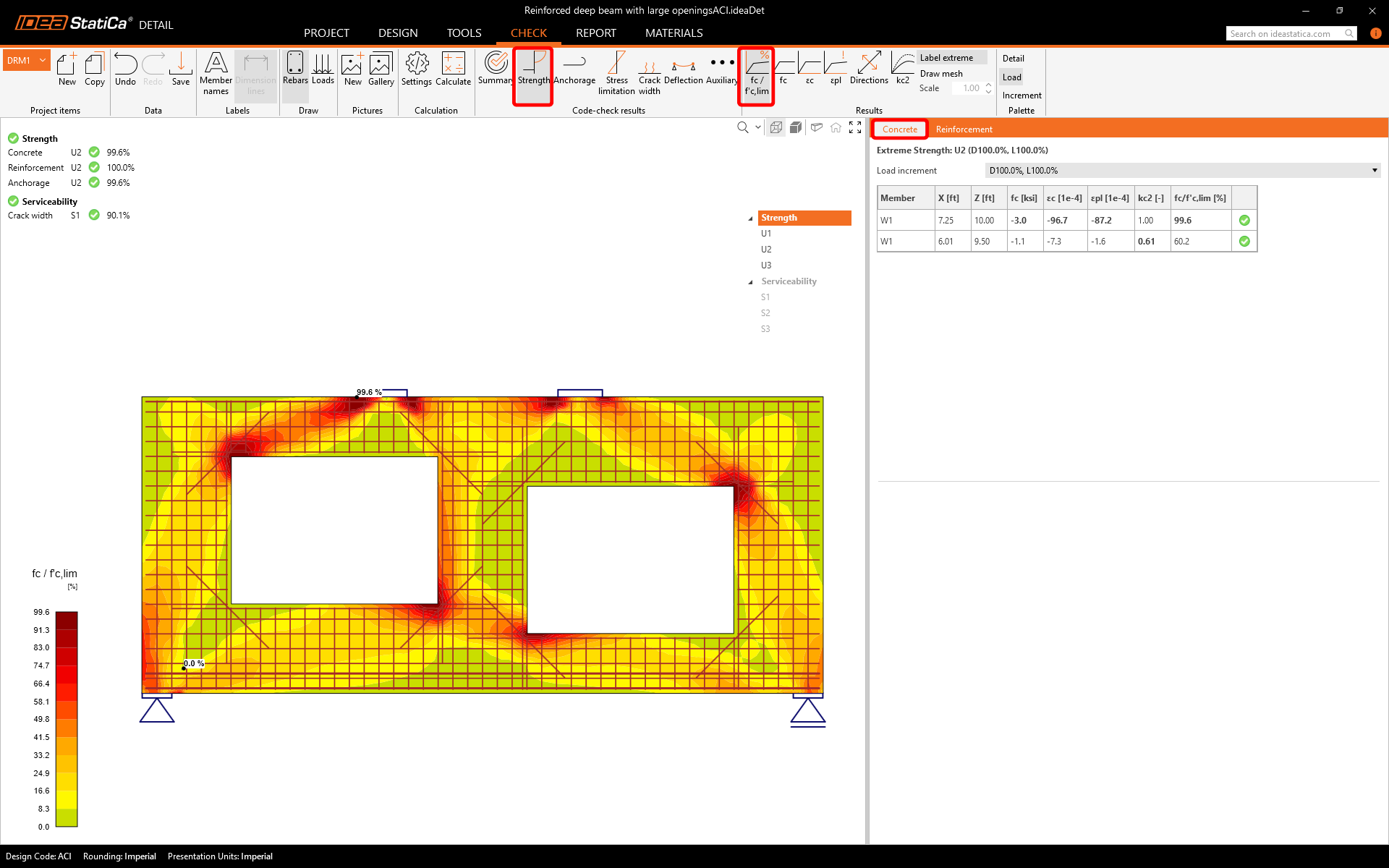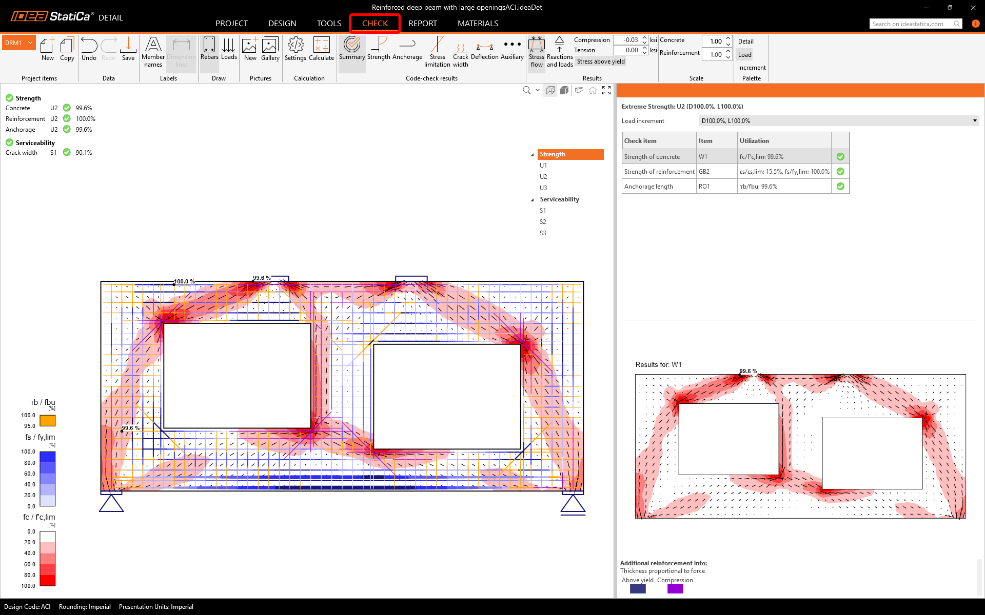 To go through the detailed checks of each component, start with Strength. This will show concrete checks such as utilization in stress, the direction of principal stresses and strains, which can be switched on in the ribbon. Also, you can change directions and scale of stress.