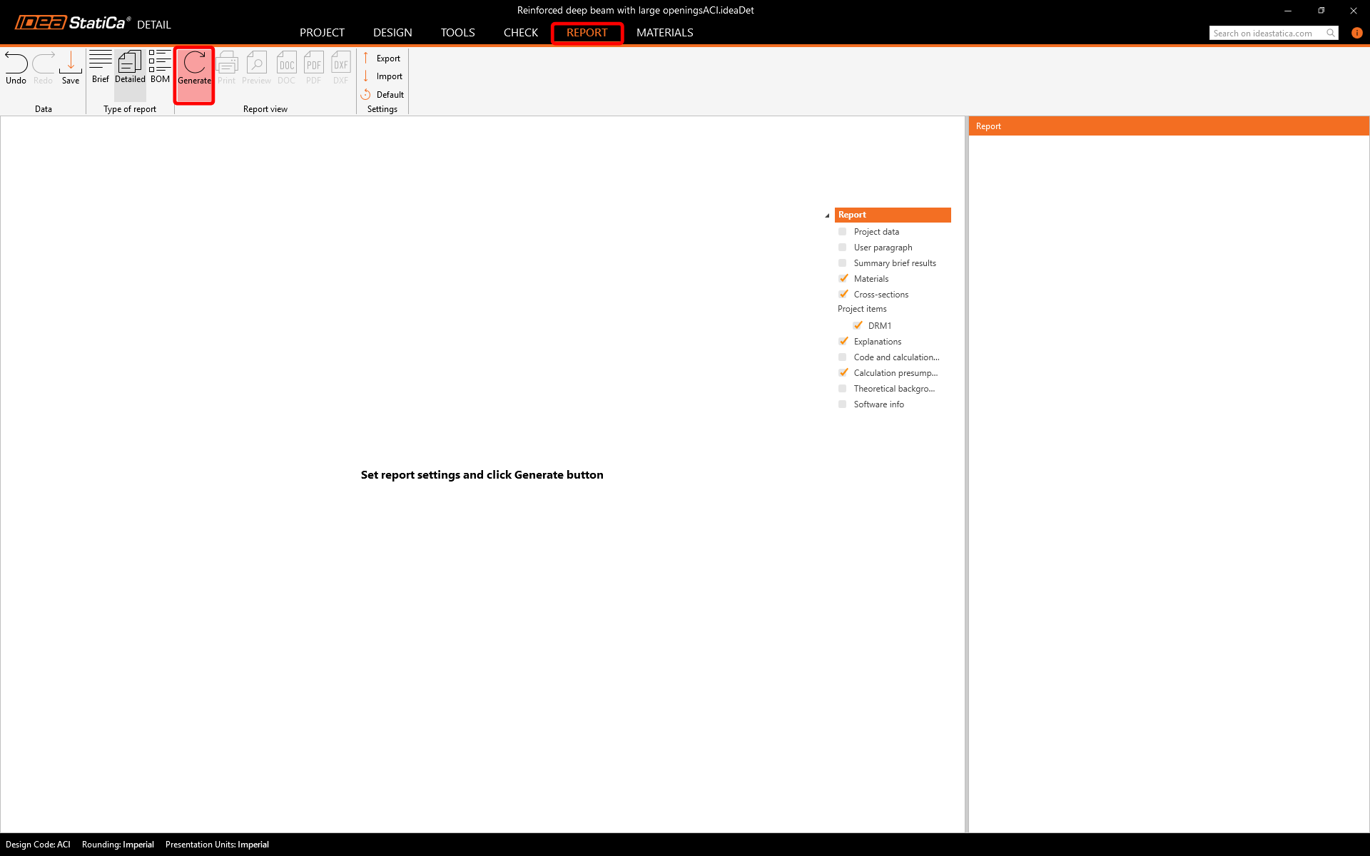 Now it is time to print a report of your calculations. Go to the Report tab. You can choose Brief or Detailed type of report and further adjust the report based on your needs in the tree menu. Select the preferred options and press Generate in the top ribbon.