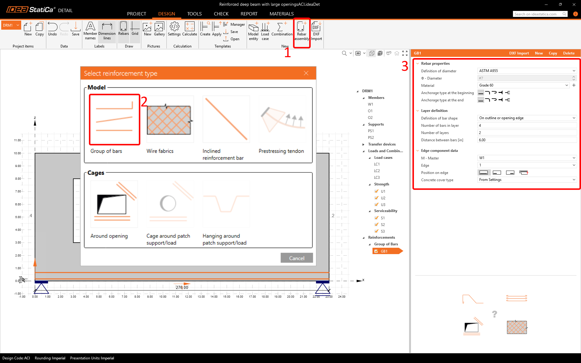 Now design the reinforcement. Click on the Rebar assembly in the section New. Select reinforcement type Group of bars and define the properties of GB1.