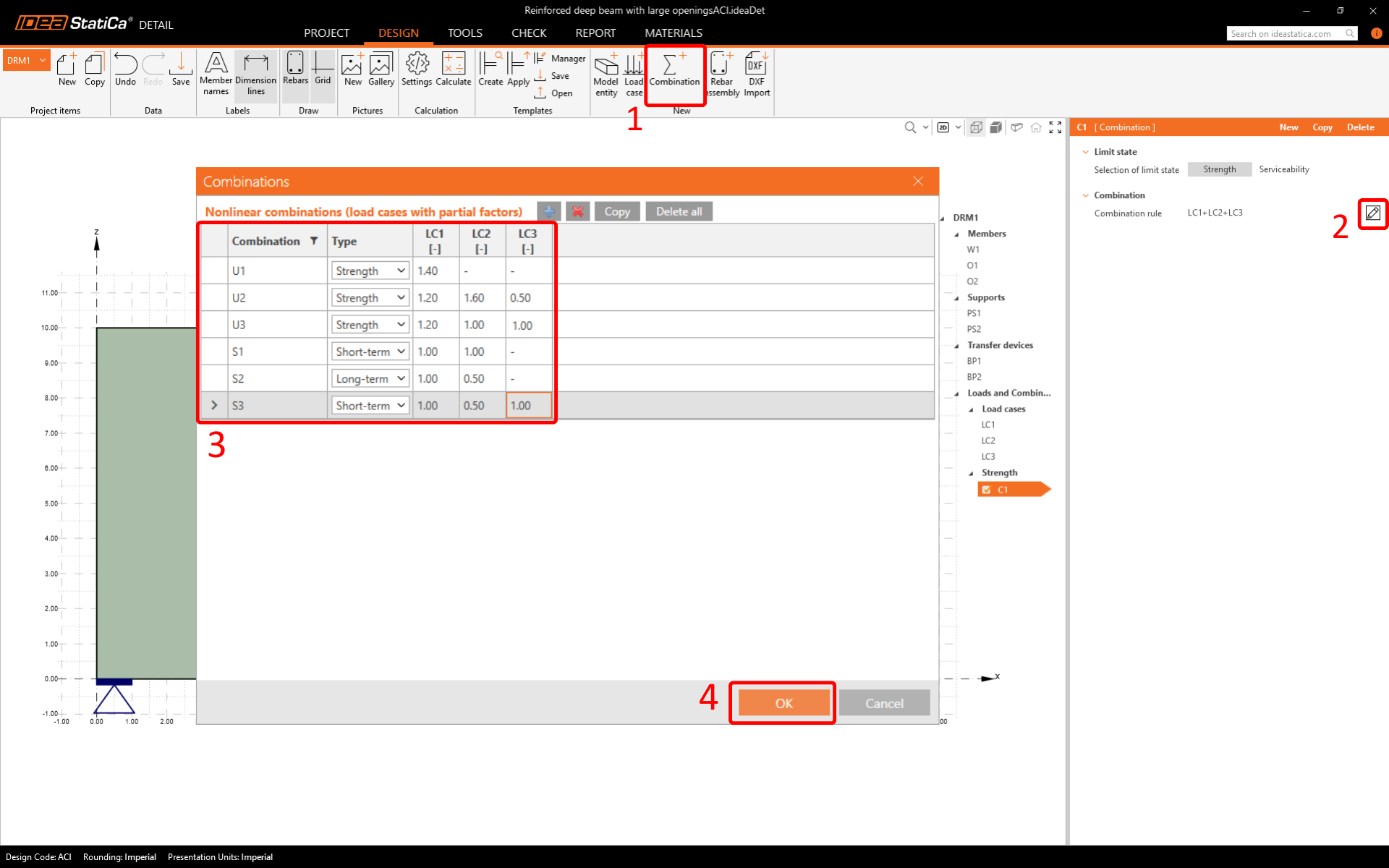 Load combinations can be created from the top ribbon command Combination. Add six combinations C1-C6, and then click on the Pencil icon to edit the combination factors.