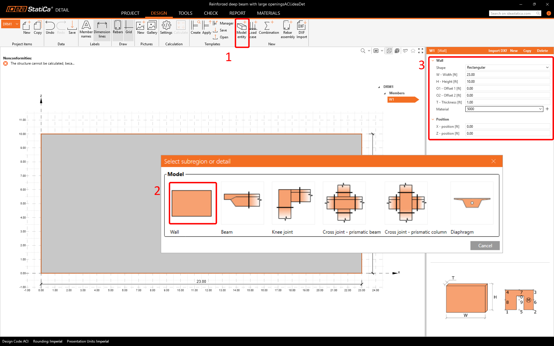 We will start with creating the Members. Use bottom in top ribbon to add a new model entity - Wall. Then, edit dimensions and position of the wall as shown in the image.