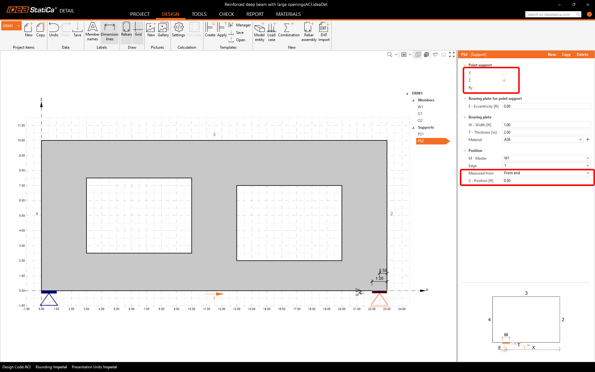 In this step, you also define the design code (choose ACI) as well as the concrete grade and cover (use concrete 5000 and cover 1.50 in). You can change your choice of material (or add another one) later. Nevertheless, the design code can be chosen only in this first step of the project.