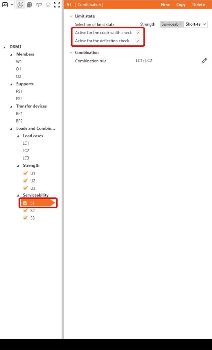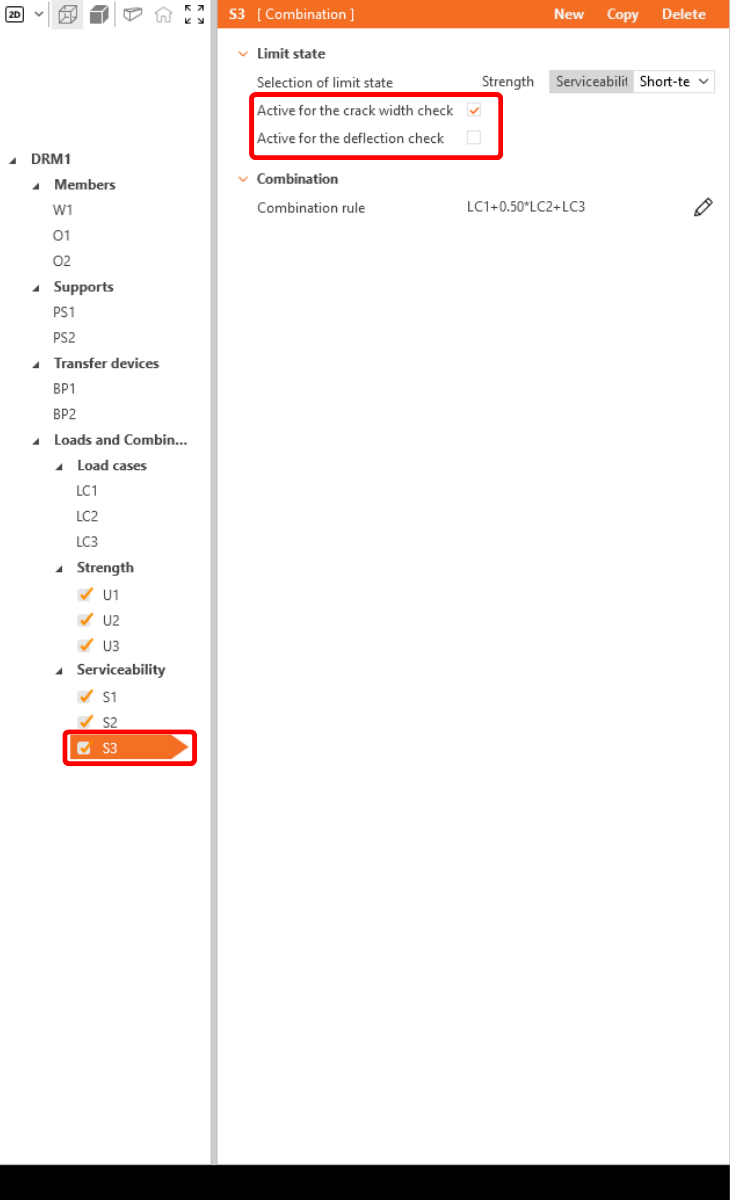 In the tree list, the combinations are divided into Strength (U1-U3) and Serviceability (S1-S3) groups. To activate crack width or deflection checks, tick the corresponding checkboxes in the property window under Serviceability combinations.