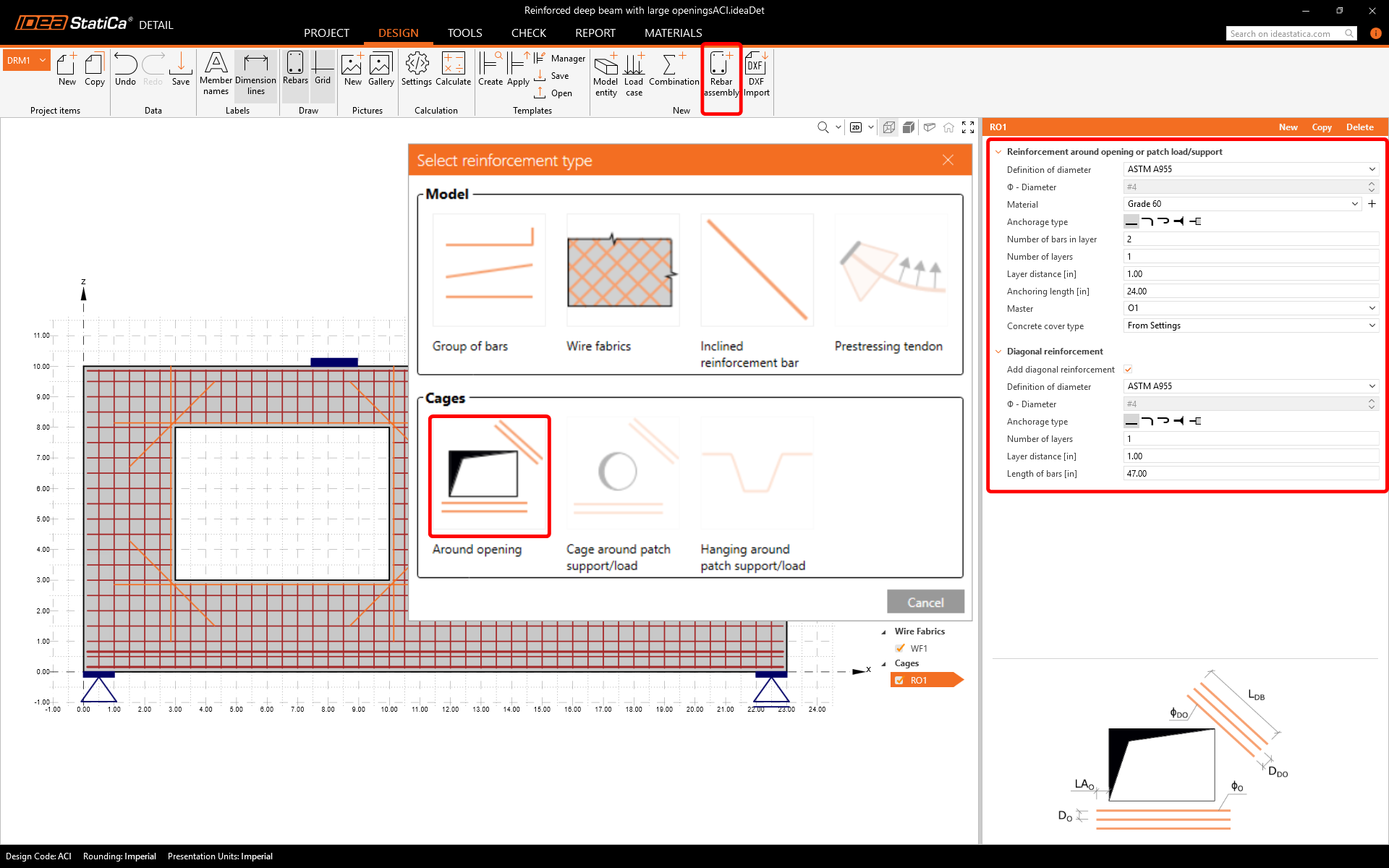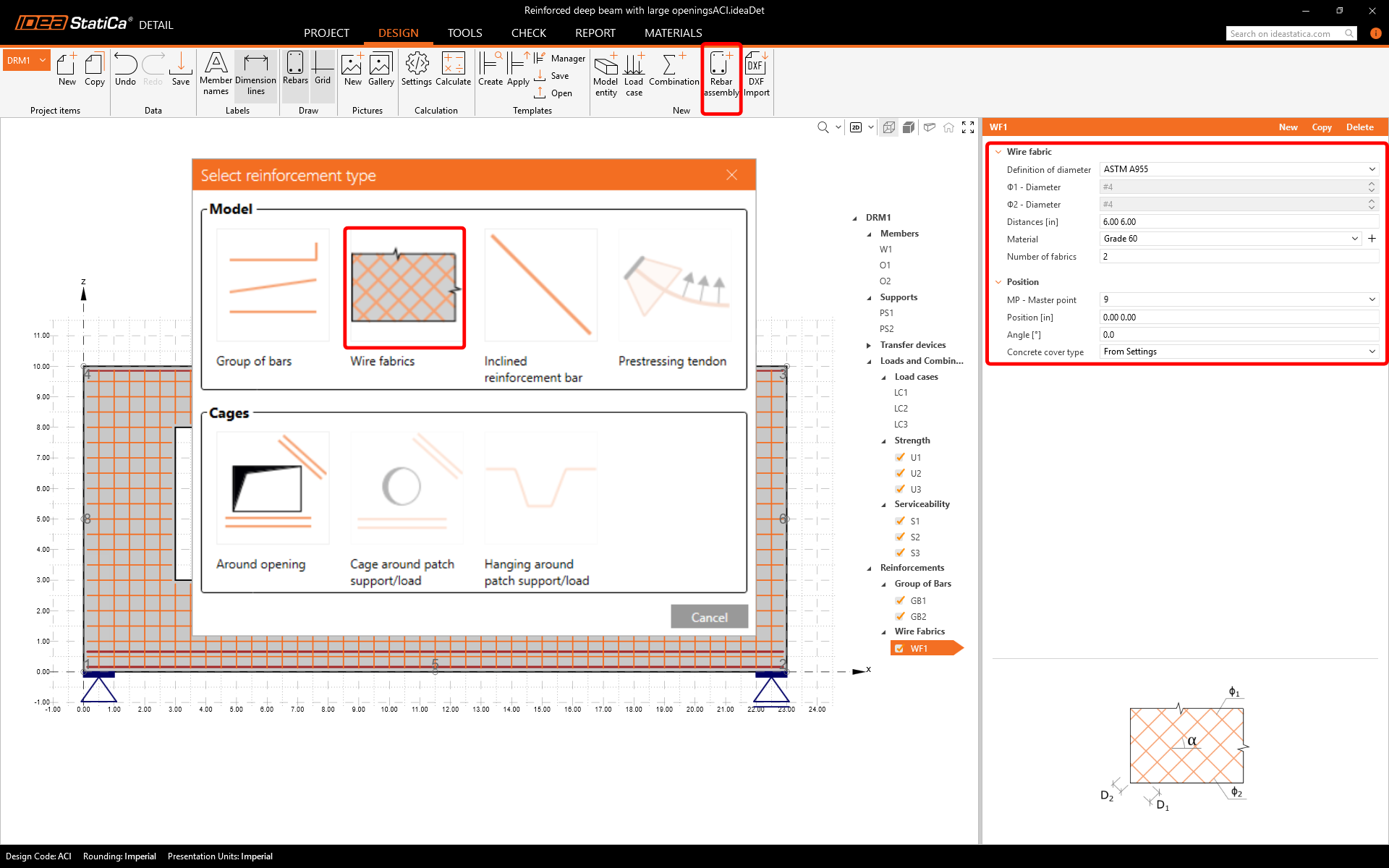True Rebar assembly button you can add not only Group of bars, but also other types of reinforcement, which will speed up your modeling process. In this tutorial we will use Wire fabrics WF1 and Cages around openings RO1 and RO2.