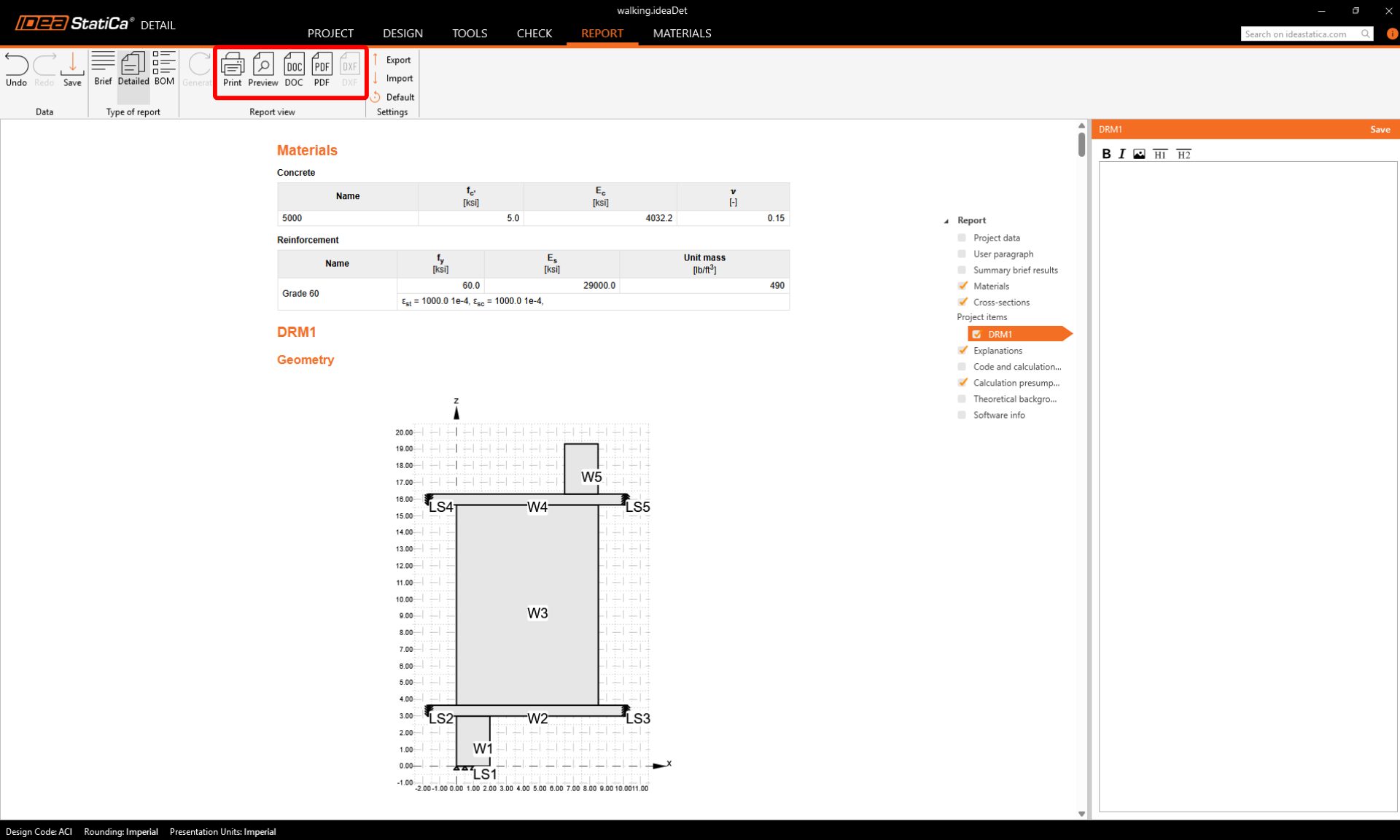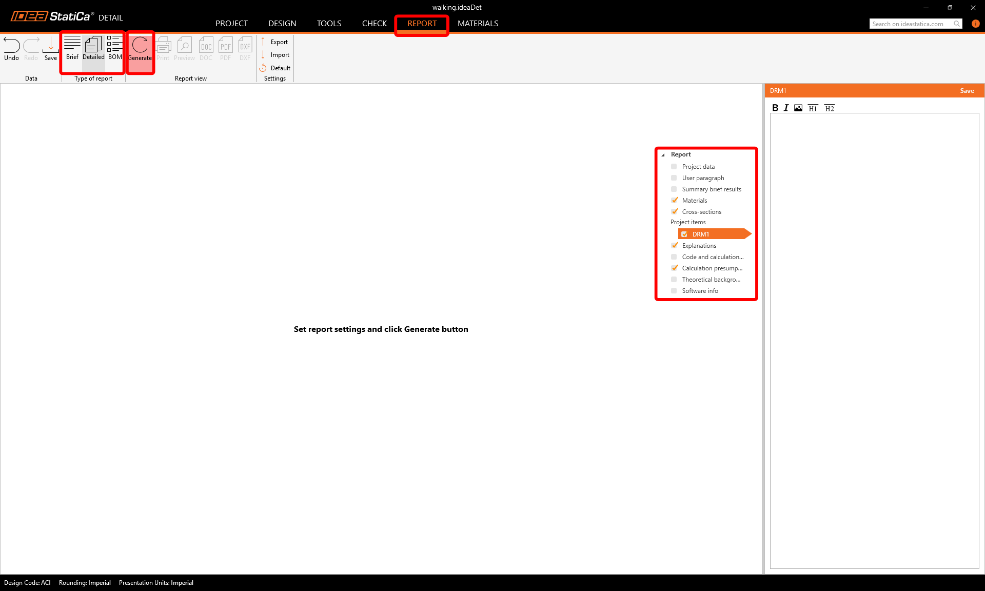 Now it is time to print a report of your calculations. Go to the Report tab. You can choose Brief or Detailed type of report and further adjust the report based on your needs in the tree menu. Select the preferred options and press Generate in the top ribbon.