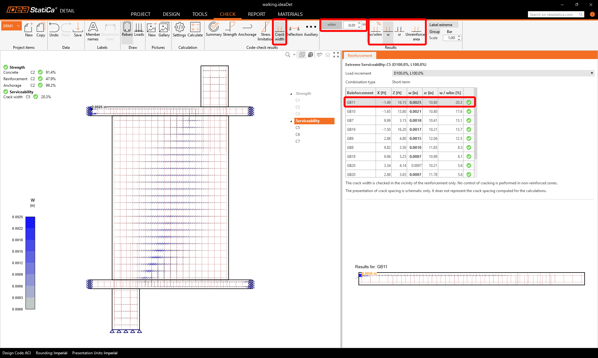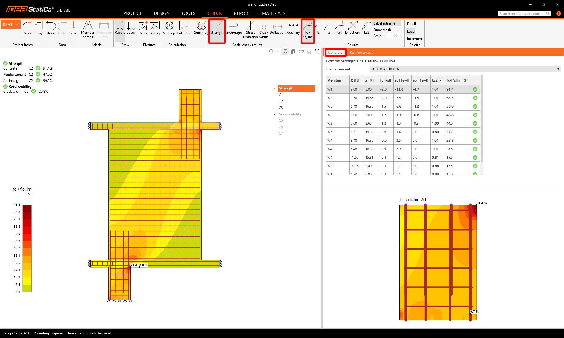 To go through the detailed checks of each component, start with Strength. This will show concrete checks such as utilization in stress, the direction of principal stresses and strains, which can be switched on in the ribbon. Also, you can change directions and scale of stress.