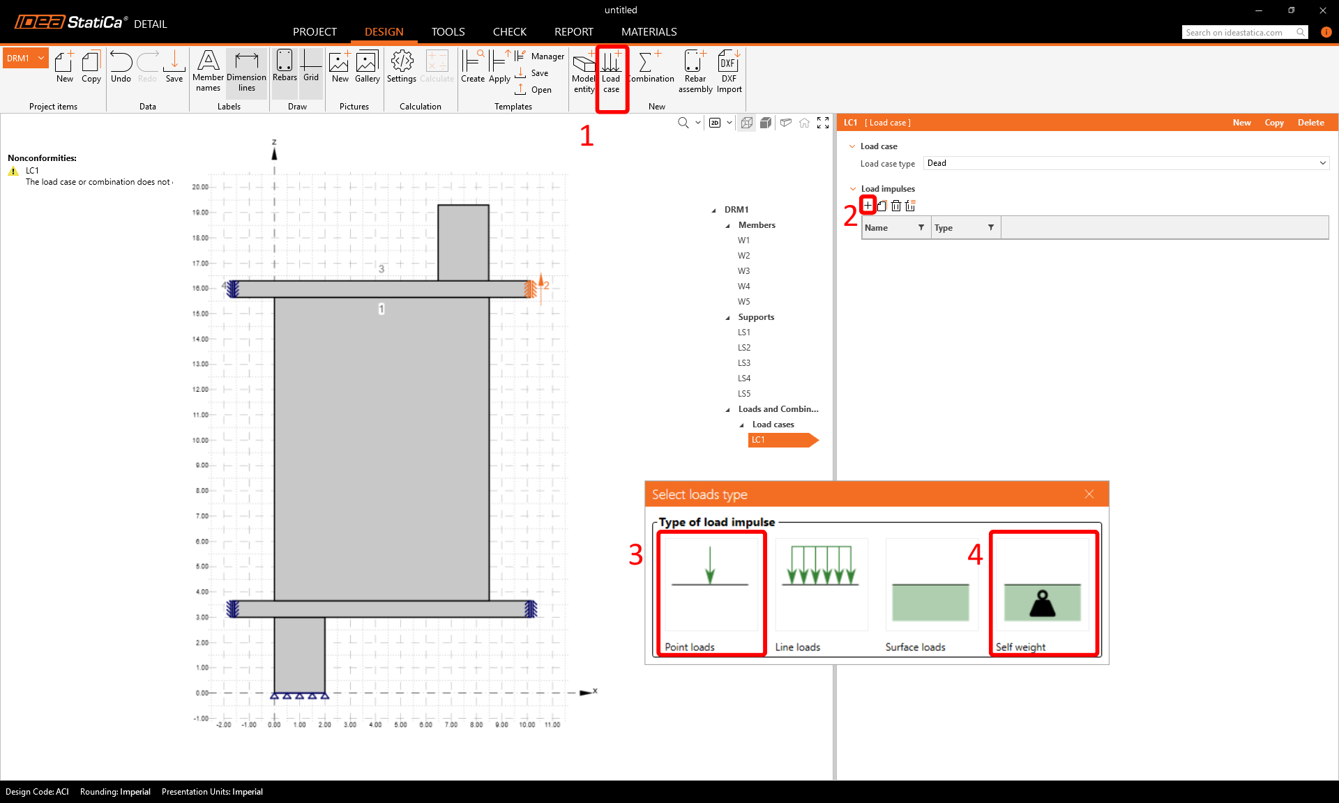 To add a load, click on Load case in the ribbon. A load case LC1 is created. Use the plus (+) button to insert a load impulse within this load case — choose Point Load and then repeat adding another load impulse with Self-Weight. Create two more load cases LC2 and LC3 with only Point load impulses.