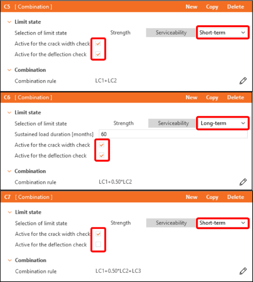 In the tree list, the combinations are divided into Strength (C1-C3) and Serviceability (C4-C6) groups. To activate crack width or deflection checks, tick the corresponding checkboxes in the property window under Serviceability combinations (C4-C6).