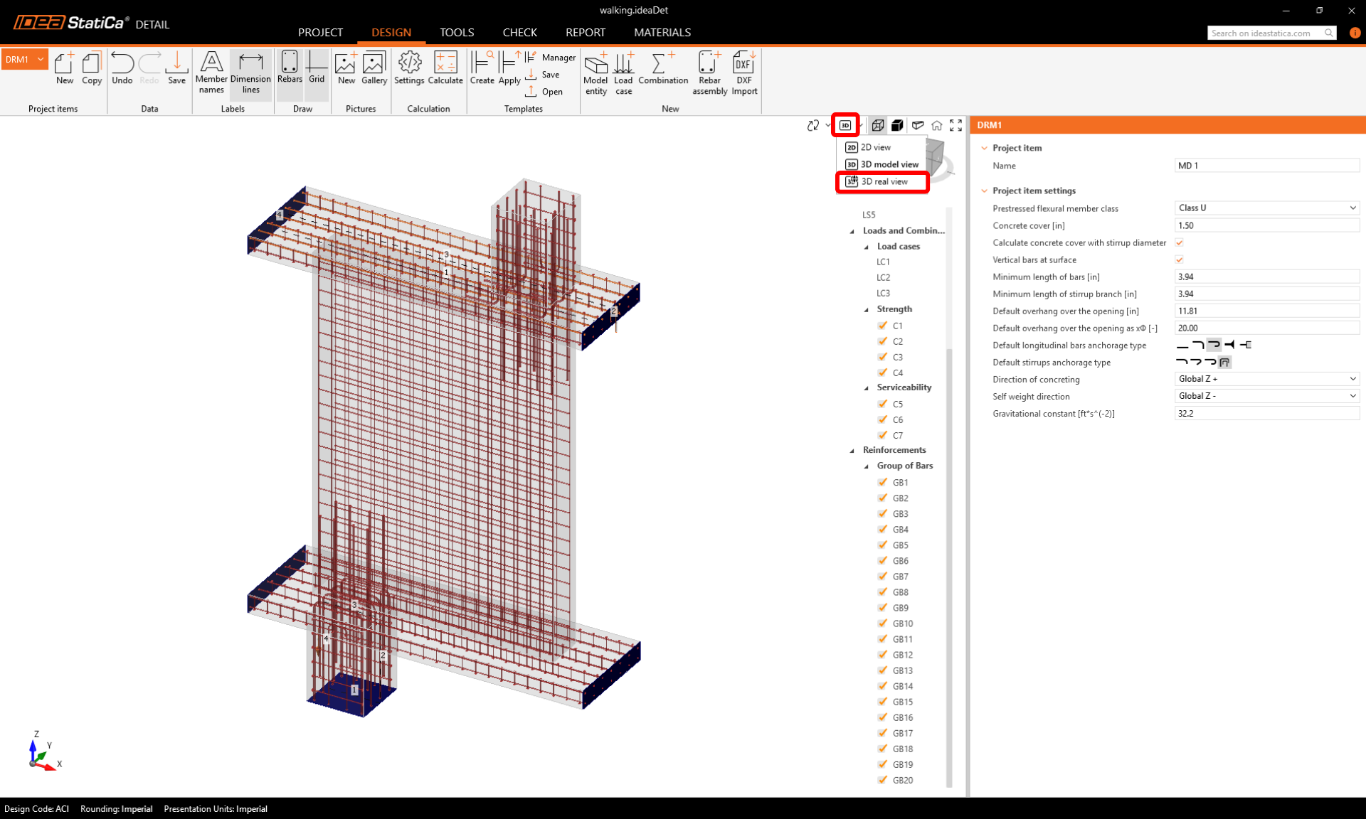 For a final check, switch back to the Design tab and choose the Real 3D View to inspect the rebar alignment visually.