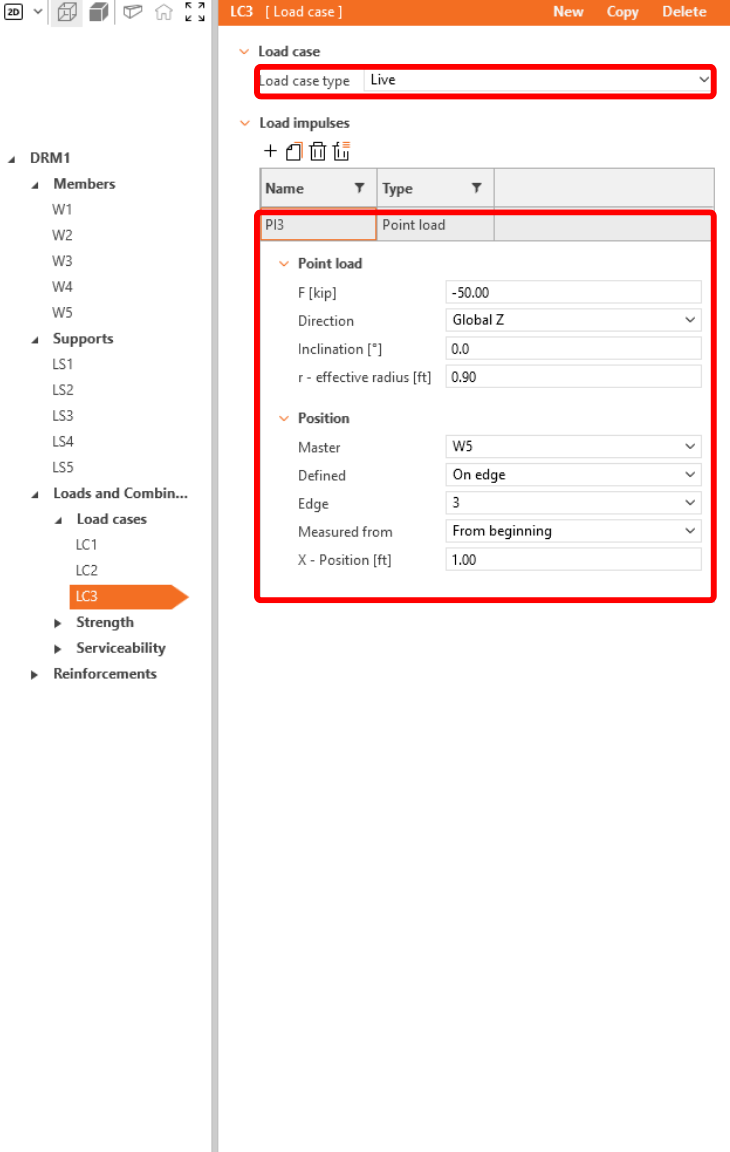 In order to be able to distinguish between short-term and long-term effects, make sure to correctly assign Dead and Live load case types and input the point load force values F and positions of the point forces according to the pictures.