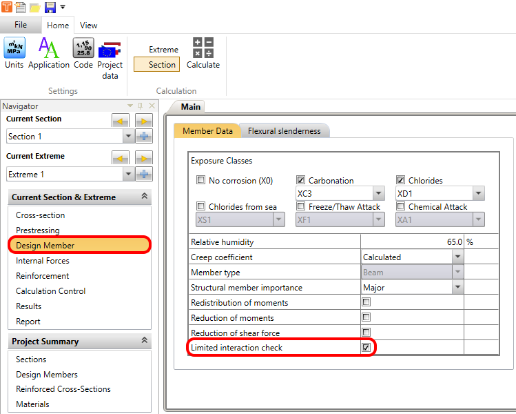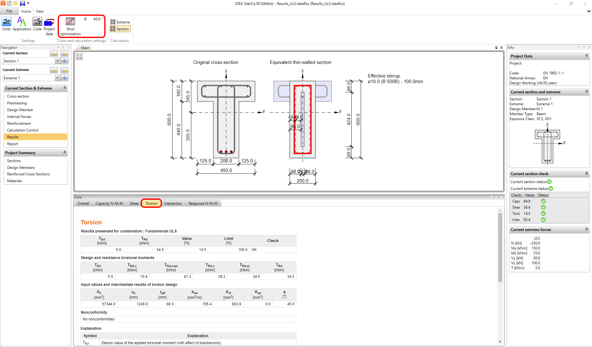 The next tab for ULS checks is the Torsion. All of the calculations are done according to EN 1992-1-1 article 6.3. The theta angle is of course shared with the shear check and can be defined in the top ribbon as well as in the shear check.