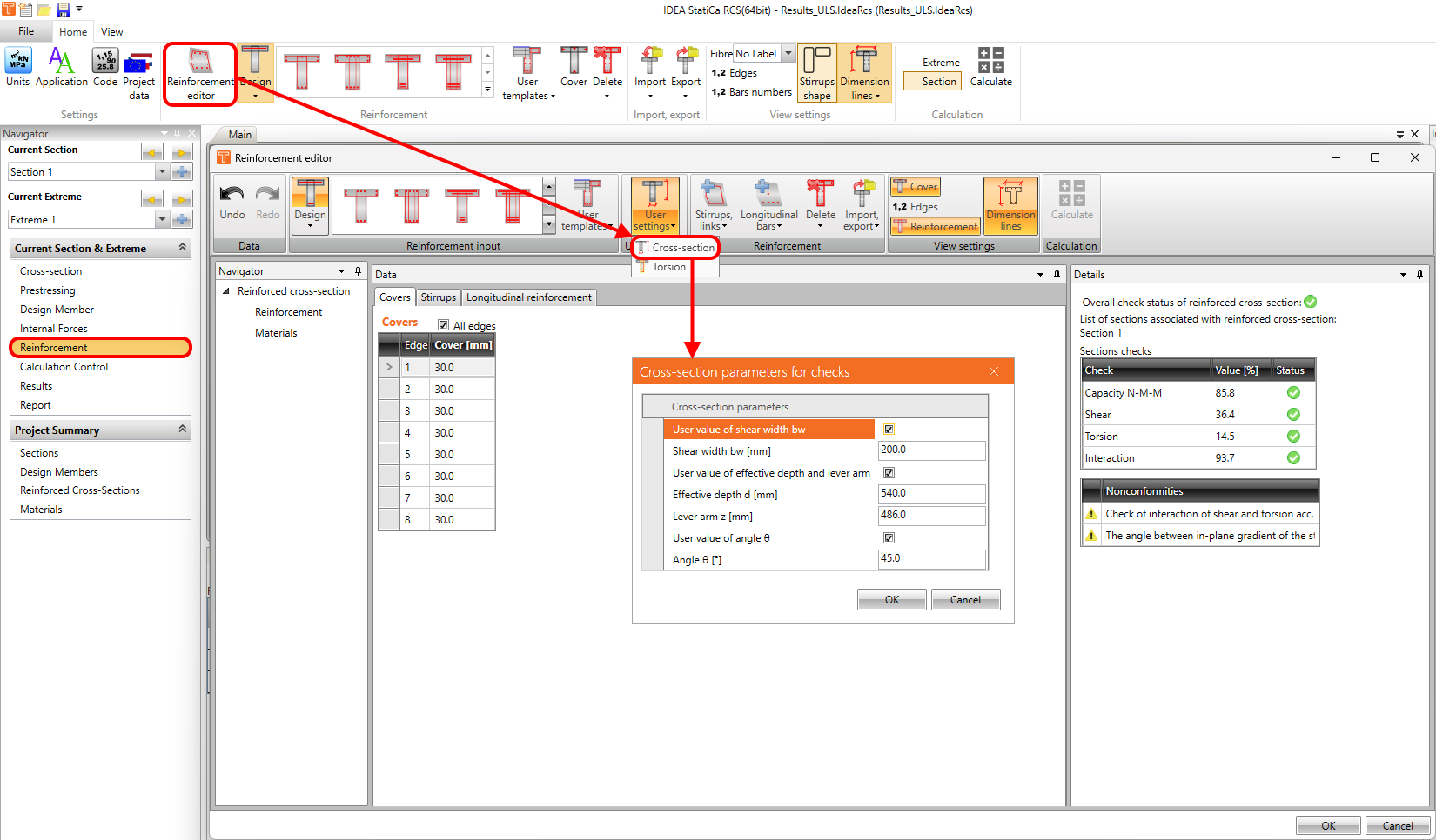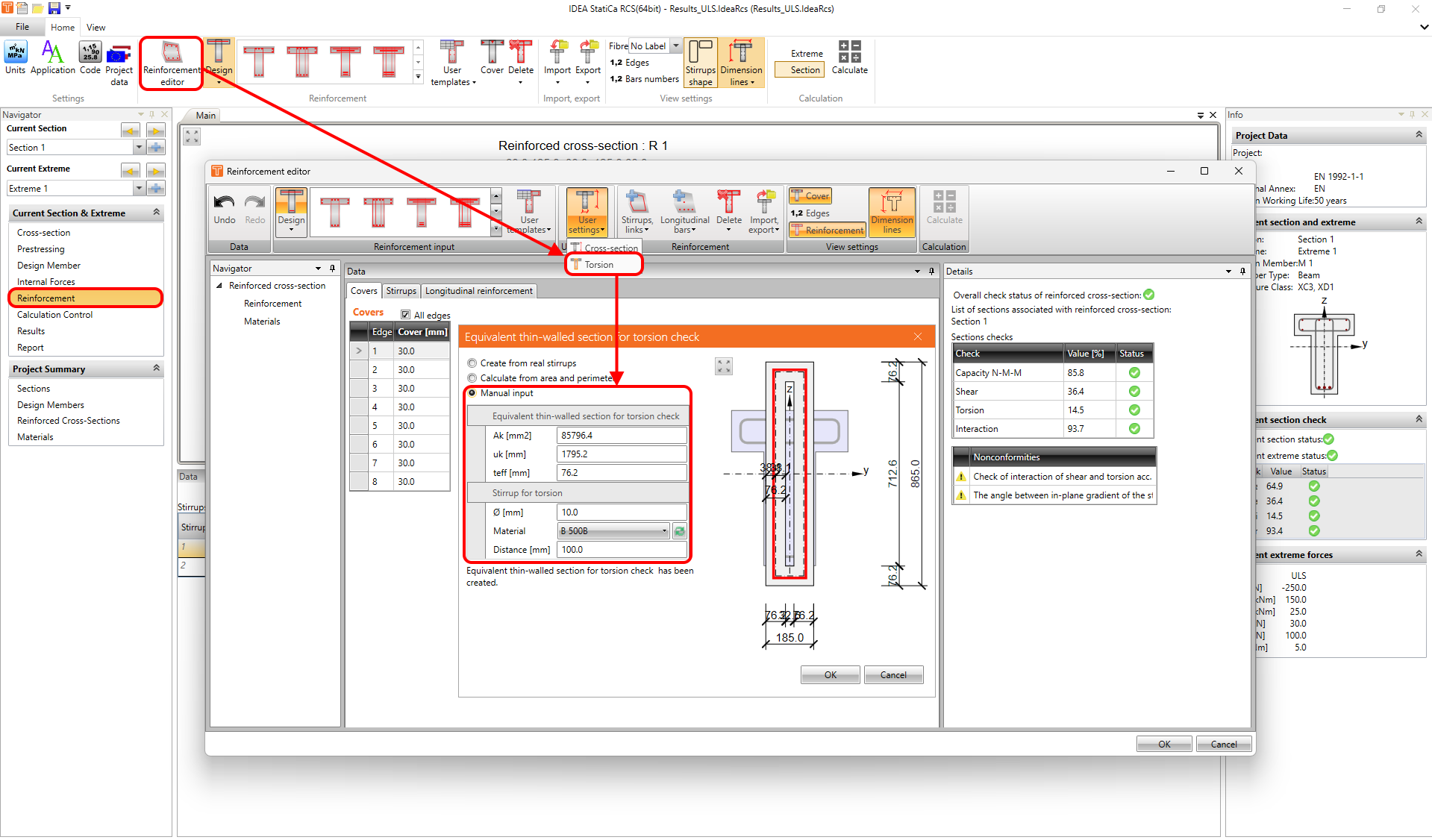 But in the case of complicated cross-sections like box girder bridges or general shapes, where multiple stirrups are usually defined for torsion, the automatic creation of the equivalent thin-walled section is not enough. In that case, go to Reinforcement editor -> User settings -> Torsion and do the manual input.