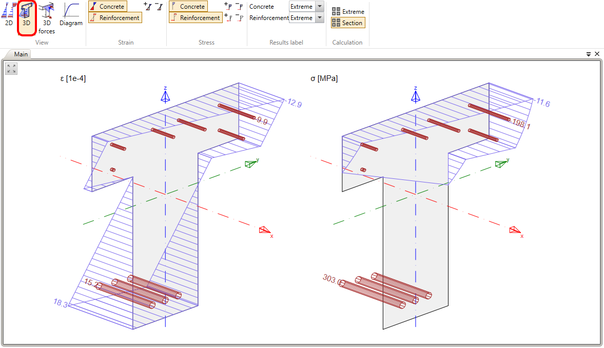 For the 2D view, you can turn off / on strain and stress in concrete and reinforcement, adjust the labels, modify the results graph, add dimension lines, and bar numbers, and display extreme fibre or extreme bar. All of these view settings are available in the top ribbon in the different toolbars.