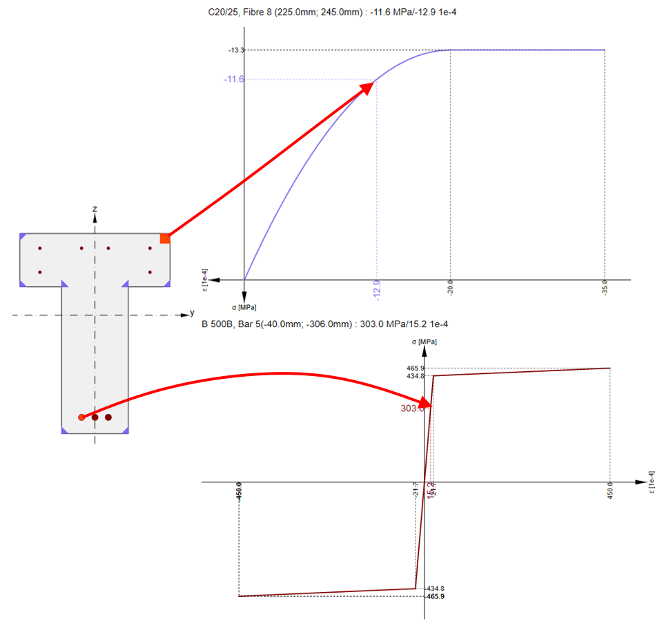 This type of calculation can find the response of the cross-section when the load is applied. The results (stress and strain) are then compared with the limits determined by the ultimate limit strain method.