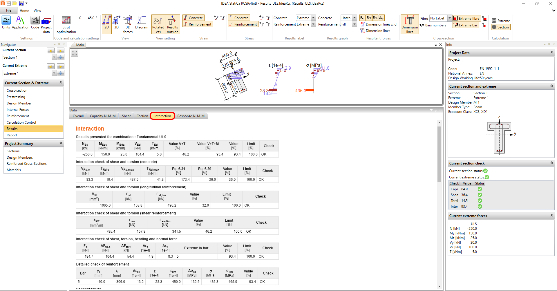 ULS results in RCS - Capacity N-M-M, Shear, Torsion, Interaction, Response N-M-M