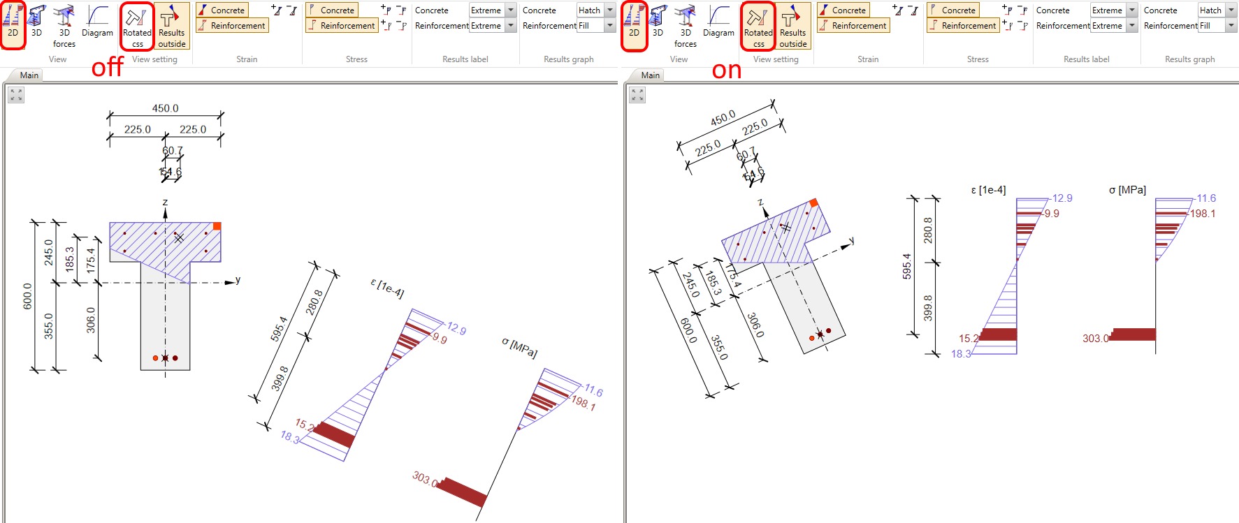 You can switch between them on the top ribbon. In the previous figure, the 2D displaying option was shown. If the option is selected, you can display a rotated cross-section or rotated results.