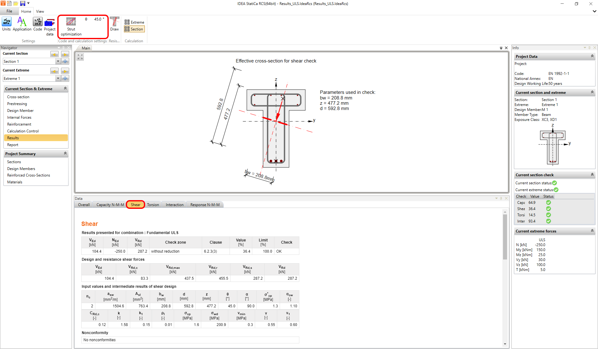 The second tab for ULS checks is the Shear. All of the calculations are done according to EN 1992-1-1 article 6.2. You can control the theta angle at the top ribbon. This angle governs the inclination between concrete struts and the beam axis perpendicular to the shear force. Or you can use the Strut optimization function, which can find the most effective angle automatically.
