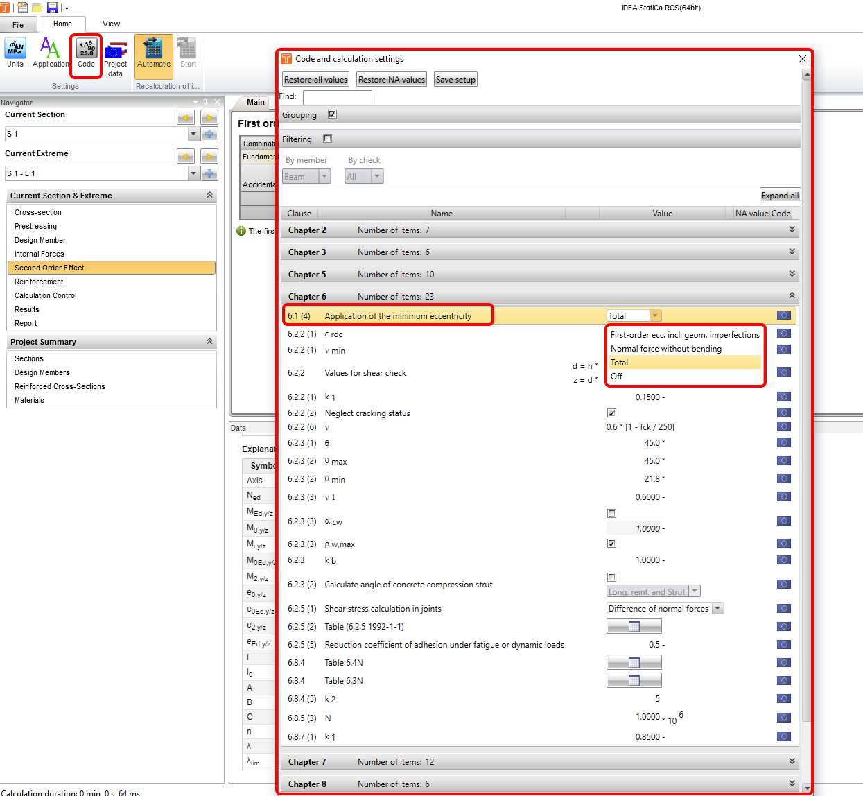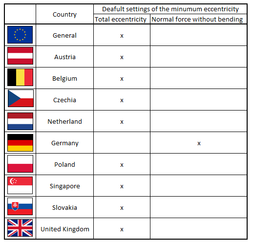 A new part, the Application of the minimum eccentricity 6.1 (4) was added to the code settings in the RCS application. Here you can select how to define the minimum eccentricity: