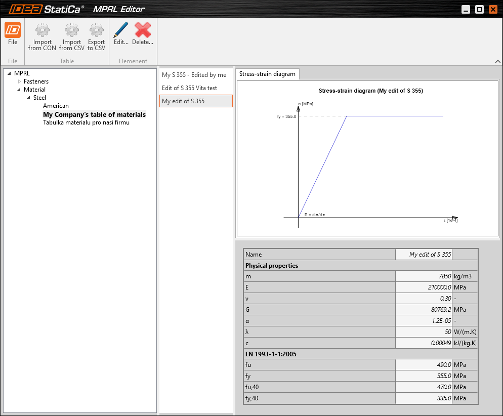 Here, the material can be edited and saved (File - Save) or deleted from MPRL. The data saved in MPRL is accessible from all IDEA StatiCa applications. It can also be shared by Export and Import with other users.
