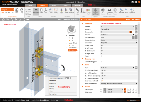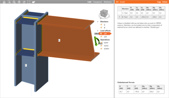 - Main window – 3D view of current joint is drawn in the Main window. List of joint members, list of load effects and list of manufacturing operations are displayed at the right edge of the Main window.