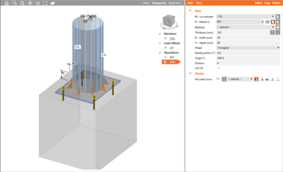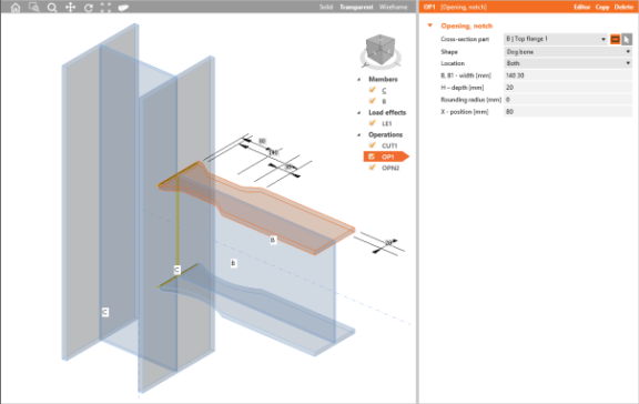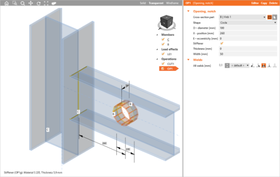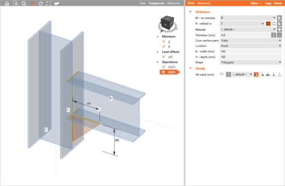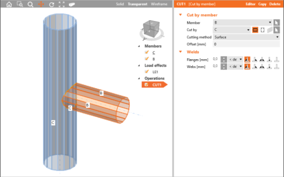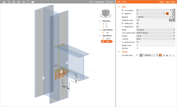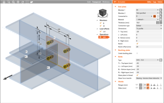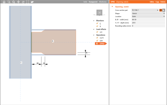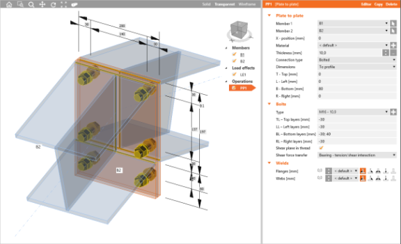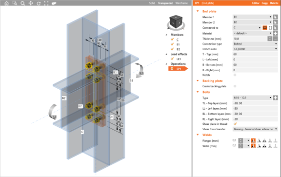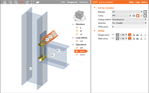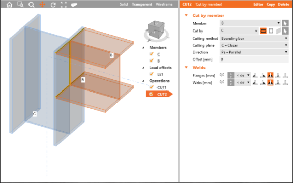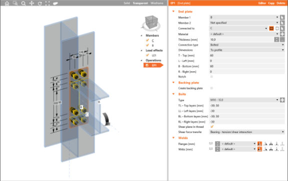 The second member processed by the operation is beam B2 – the operation creates end plate welded to the beam B2. The operation is also related to the column C – both end plates are bolted to the web of column C by the same bolts assembly.