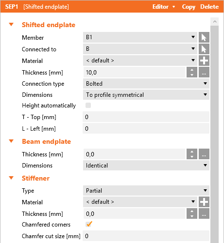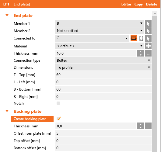 - Connection type – select the type of connection between end plate and “Connected to” member: