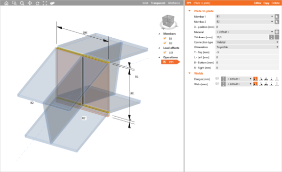 Manufacturing operation Plate to plate is applied on beam B1. The operation creates end plate welded to beam B1. The second member processed by this operation is beam B2. Because the connection is welded, beam B2 is welded to the end plate on beam B1.