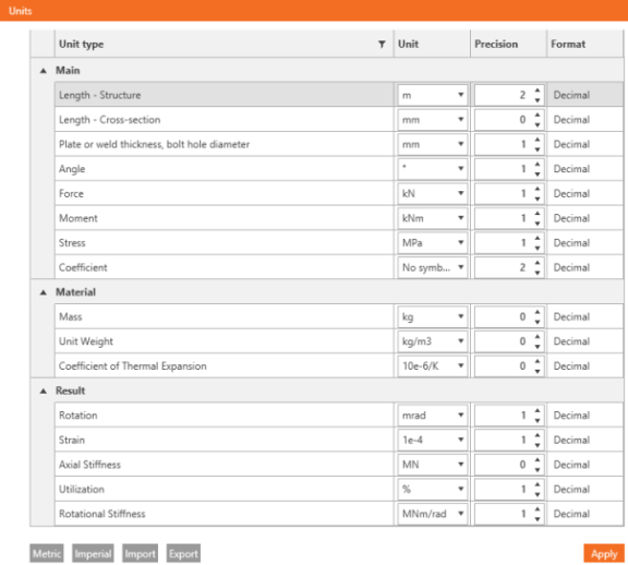 Magnitudes, for which the units can be set, are grouped into categories Main, Material and Results. The categories are displayed in the column on the left of the dialog. For the selected category the table of corresponding magnitudes is displayed. For each magnitude, which is listed in column Unit type, one of the available units can be set in the column Unit.