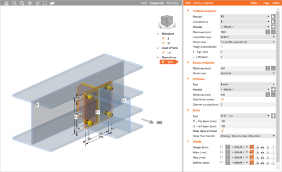 The manufacturing operation Shifted end plate is defined on beam B1. The operation creates end plate welded to the beam B1. The operation is also related to beam B – second end plate is welded on flanges of beam B (including the stiffener). Both end plates are bolted together by bolts assembly.
