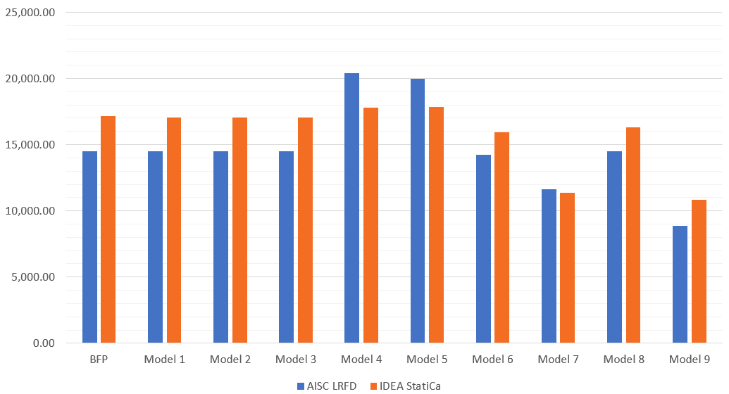In general, there was good agreement between the IDEA StatiCa results, code-checks according to the U.S. codes, and the ABAQUS results. The calculated results are different than those obtained with IDEA StatiCa possibly because AISC is a design code and may be conservative while the software is intended to capture the real behavior which is expected to be more accurate.