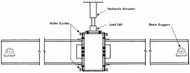 Several semi-rigid connections comprised of double angles and top and seat beam flanges were subjected to static and cyclic loadings to investigate their moment-rotation behavior. A pair of specimens was tested at the same time as shown in Figure 2.1. One side of the beam sections were bolted to the column and the other side was supported by roller-type seats. The vertical movement of the stub column was allowed by roller guides attached to the top and bottom of the column. The hydraulic actuator was used to apply the load on the column and the connection transferred the load to the beams.