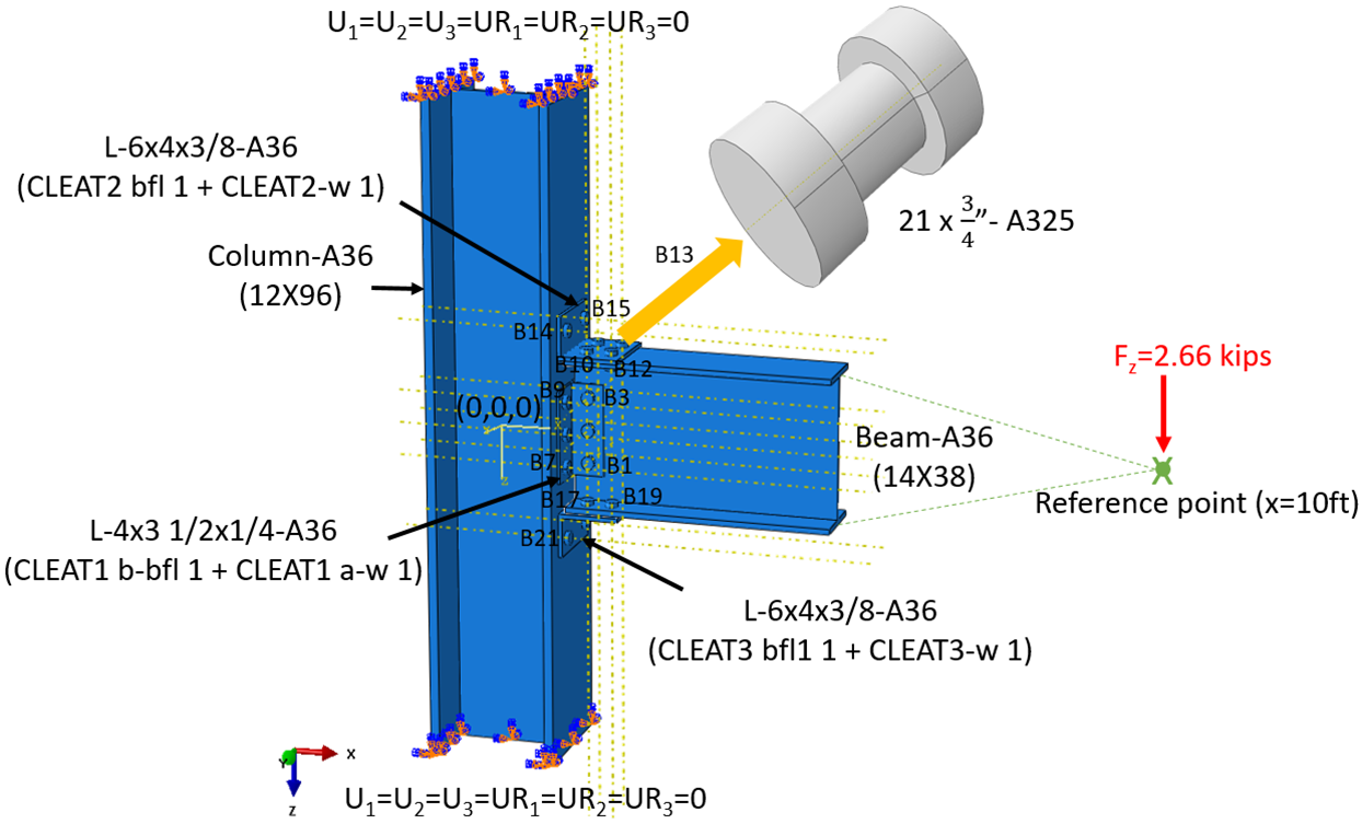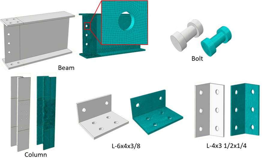 In this section, the output results from IDEA StatiCa were compared to those from ABAQUS (2020) software package. In this study, Test No. 14S1 specimen was chosen as a base model. Numerical simulations with almost identical conditions (i.e., in terms of material properties, boundary conditions, and loading) were carried out using both IDEA StatiCa and ABAQUS. The model was initially designed in IDEA StatiCa and then the assembly (including beam, column, web angles, and top and seat angles) was imported to ABAQUS using the IDEA StatiCa’s viewer platform. Afterward, a simplified model for the bolt was designed and added to the ABAQUS model.