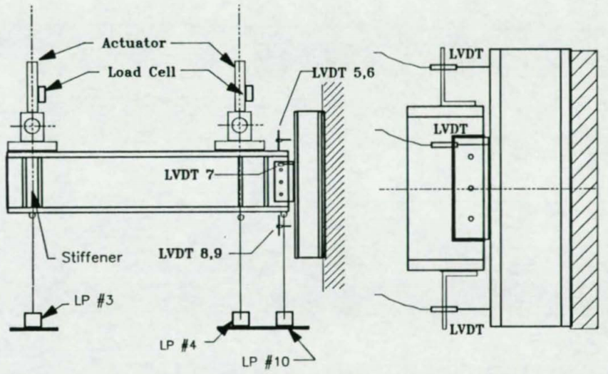 Seven full-scale steel beam-column connection specimens were tested, and results were presented in McMullin and Astaneh (1988). Each connection specimen was bolted to the beam and welded to the column with double angle sections. The main goal of these tests is to apply only shear force in the connection with very small bending or moment. To achieve this objective, the actuator near the connection applies the shear force. The actuator near the tip of the cantilever aims to keep the beam horizontal and limit the rotation (bending) of the connection.