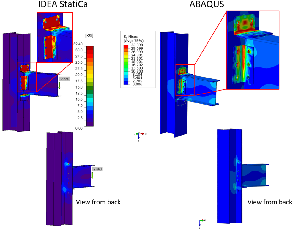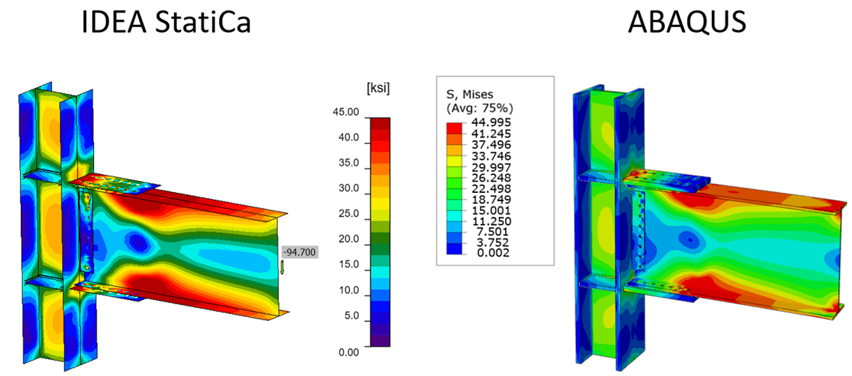 In general, there was good agreement between the results of the two software packages. However, more deformation was captured on the web angles, top, and bottom flanges in the IDEA StatiCa model. Also, the stress distributions on the web angles were slightly different between the two models. This is most likely due to the fact that in the ABAQUS model solid elements with reduced integration were utilized. In both models, it was found that the weakest component of the assembly was the top flange in tension under the applied shear force pointing downward, which introduces tension in the top flange.