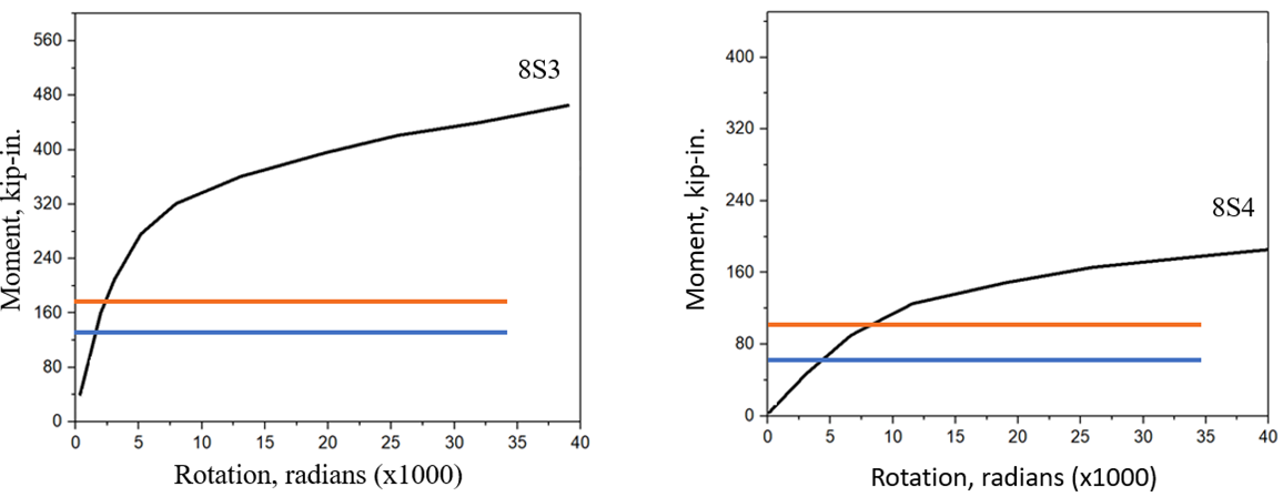 Moment-rotation relationship of Test No: 8S3 (left) and 8S4 (right)