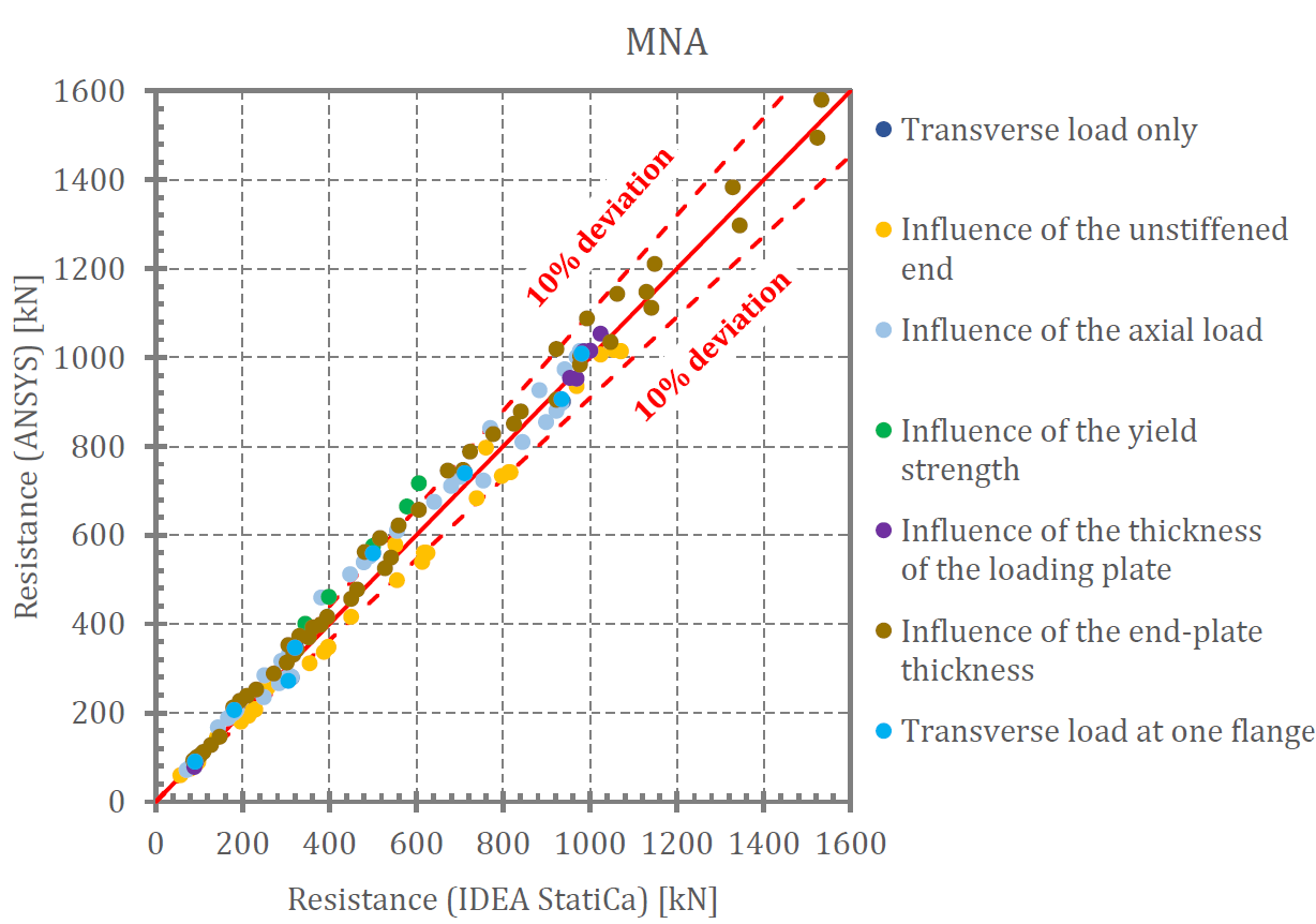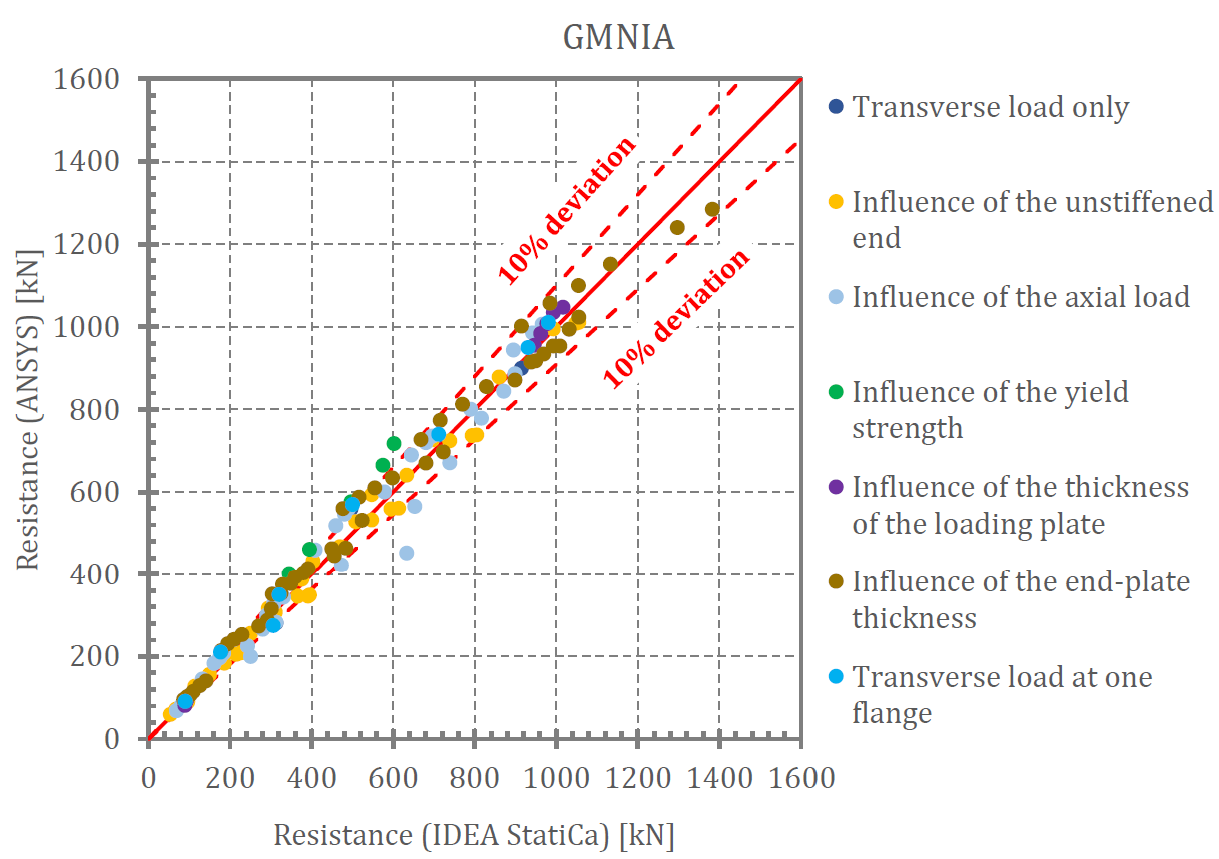 This work prepared at Brno University of Technology compares the results of IDEA StatiCa Member (MNA, LBA, GMNIA), ANSYS (MNA, LBA, GMNIA), Eurocode and AISC 360 for component Web in transverse compression.