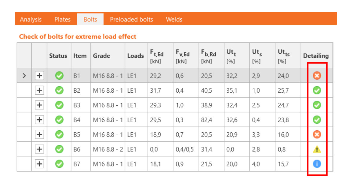 The Detailing check in IDEA StatiCa Connection is improved. Engineers may have a better overview of the design and code-check of bolts and welds thanks to thorough information and recommendations according to Eurocode provided in Check tables as well as in the Report.