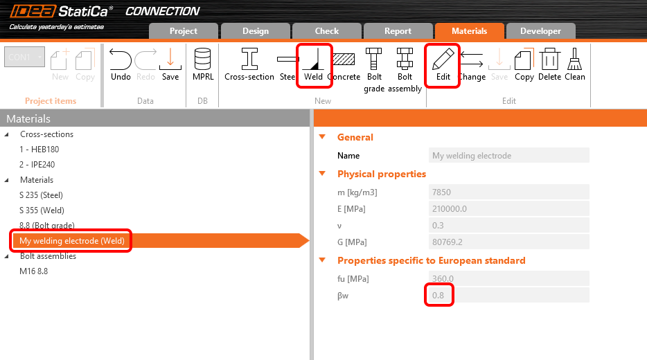 To add a user-defined welding material, go to the tab Materials, add a Weld material, and Edit its properties.