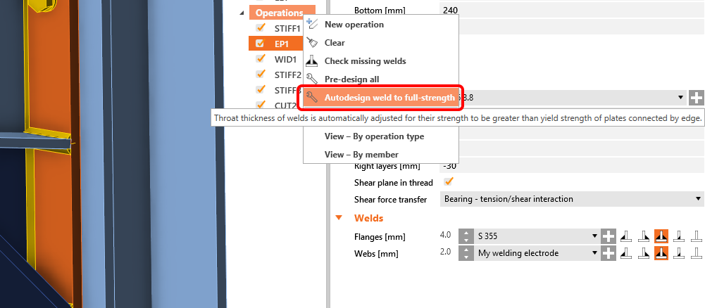 You can run the Autodesign weld to full-strength algorithm for all welds within the connection project at once via the right mouse button on Operations in the tree menu.