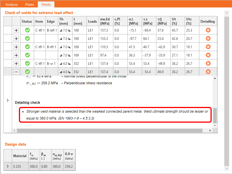 When the Detailing check is activated in the Code setup of the Connection app, users get a warning if a welding electrode material is stronger than the welded plates. This helps to ensure design safety standards.