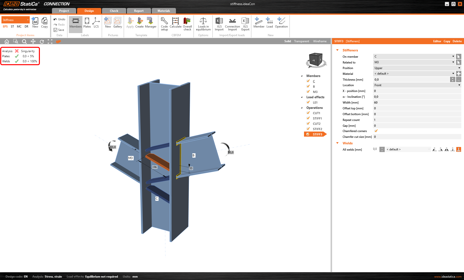 Singularity warning informs about the analysis stop due to mathematical nonconformity. This may occur when, e.g., a single plate is not connected to the connection model and thus "flies" away because the finite elements of this plate are not supported anyhow, the gap between connected plates is too wide, etc.