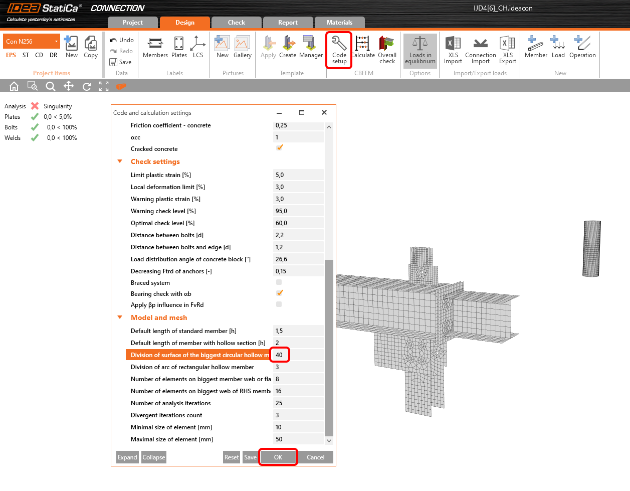 To resolve this error, open the Code setup and change the default value of the Division of surface of the biggest circular hollow member from 64 to some lower number, e.g., 40