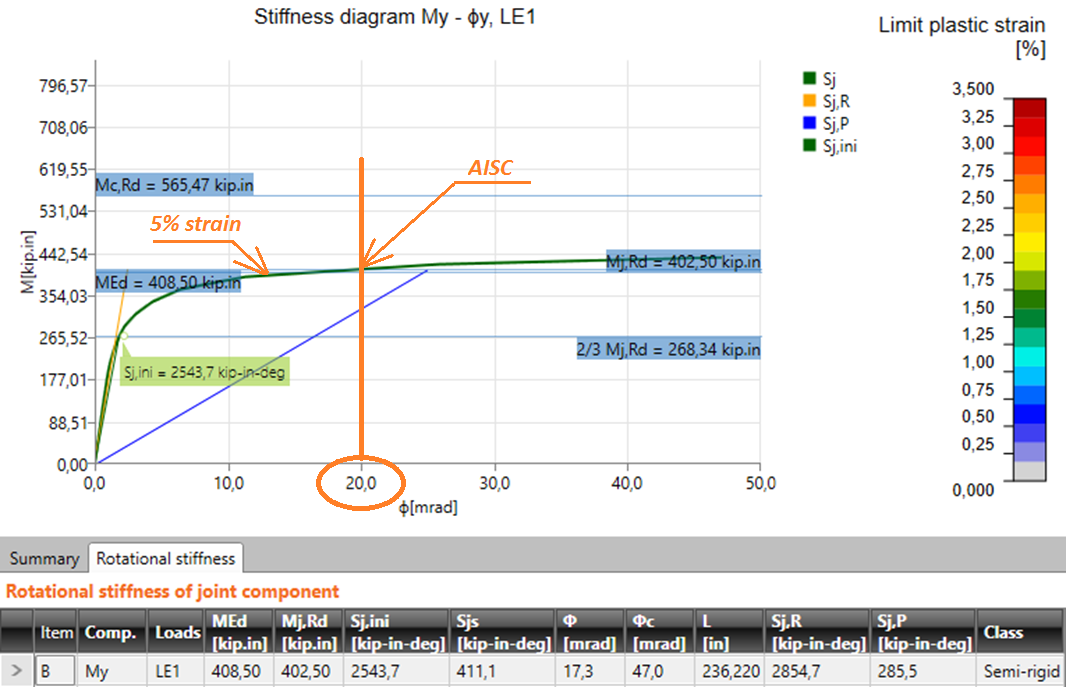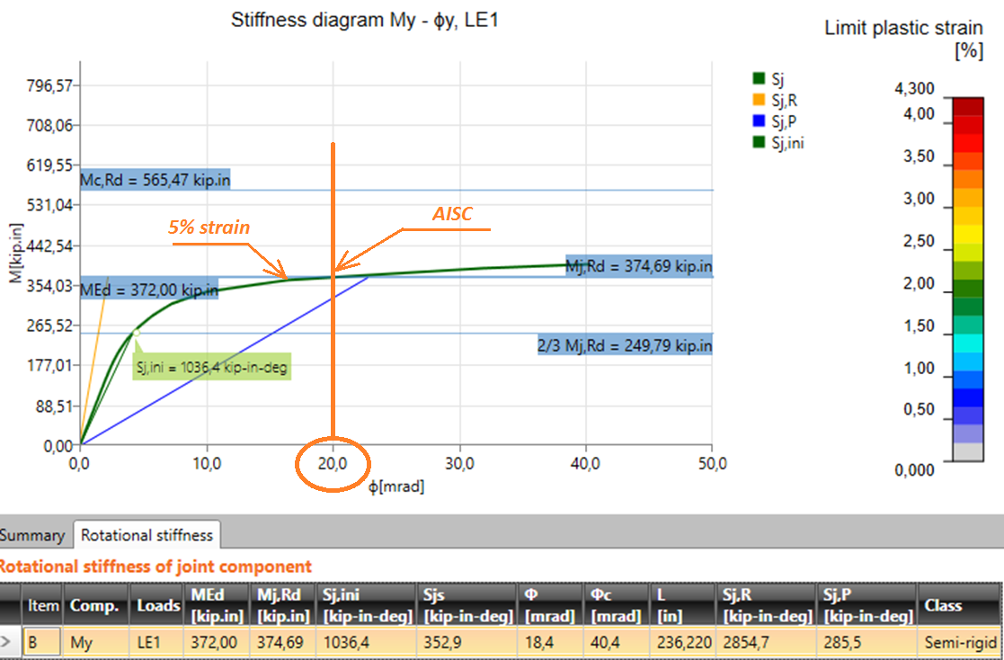 Again, the resistance determined by rotation 20 mrad (MRd = 372 kip-in) closely coincides with the resistance determined by limiting plastic strain to 5 % (MRd = 374.7 kip-in).