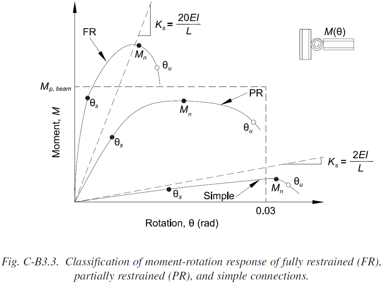 ANSI/AISC 360-16 uses a different approach. In Chapter B – Design requirements, there is an article: “Connection Strength. The strength of a connection is the maximum moment that it is capable of carrying, Mn, as shown in Figure C-B3.2. The strength of a connection can be determined on the basis of an ultimate limit-state model of the connection, or from physical tests. If the moment-rotation response does not exhibit a peak load then the strength can be taken as the moment at a rotation of 0.02 rad (Hsieh and Deierlein, 1991; Leon et al., 1996).”