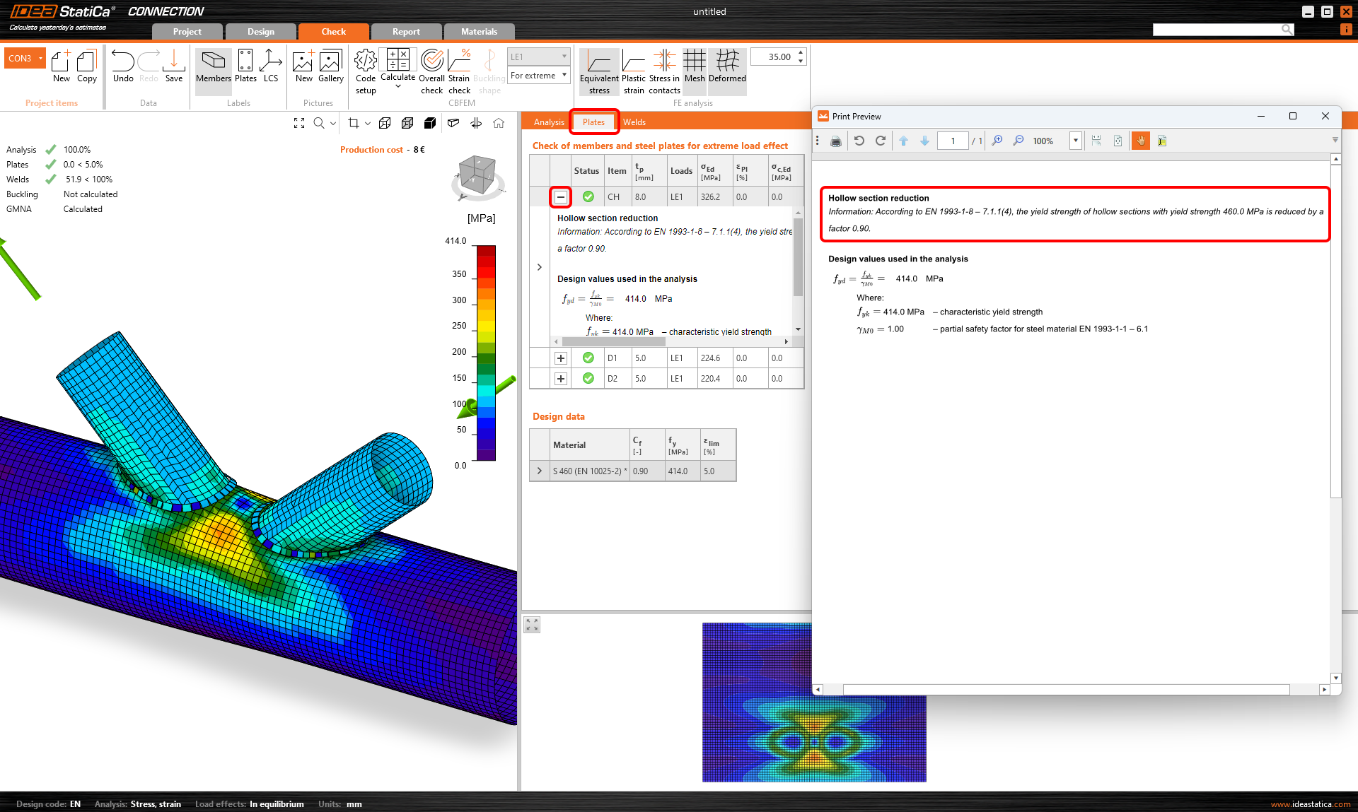 The yield strength of hollow section joints made of CHS or RHS with high-strength steel is automatically reduced by the reducing factor from the code. This ensures unintentional neglect of the reduction, which might lead to unsafe design.