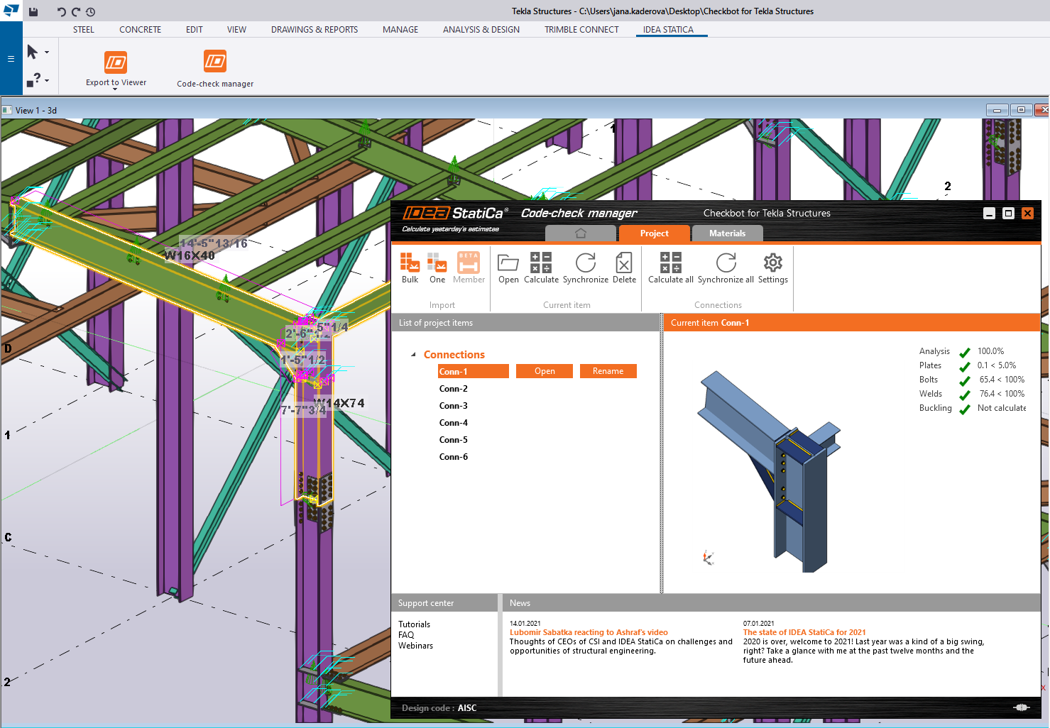 The CAD links can save plenty of time with a quick transfer of all the plates, bolts, and welds from your Tekla/Advance Steel/Revit model to IDEA StatiCa, where the engineer can input the loads from the structural model. In IDEA StatiCa, these two merge together, resulting in a realistic model of the connection loaded by the real internal forces. Now, the joint can be analyzed and checked according to the selected standard in a CBFEM calculation. Some changes in the Tekla model? Don’t worry, the link can automatically synchronize the exported model in few steps.